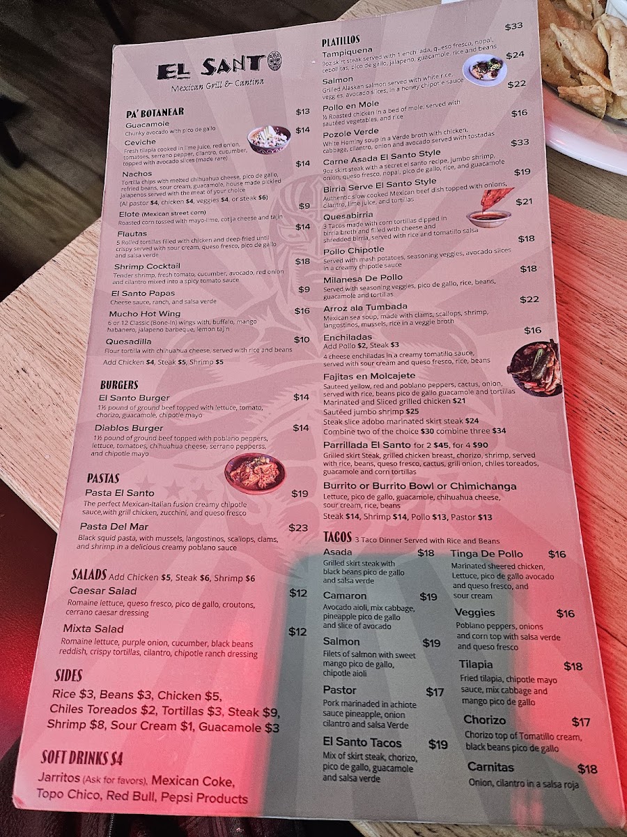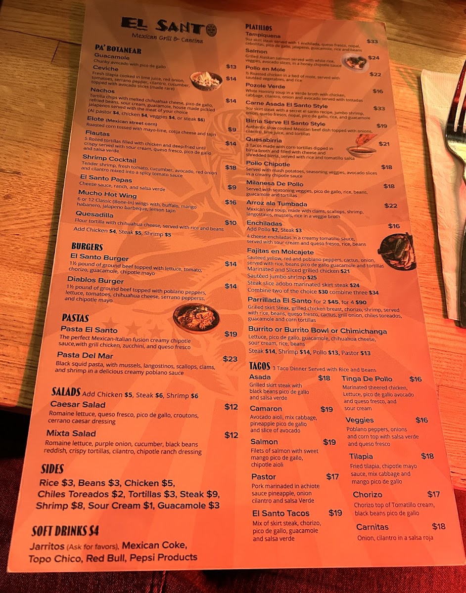 Highlights include the Pasta El Santo and signature El Santo Tacos, bringing a creative twist to classic recipes. Don’t miss the rich Mil Mascaras or indulgent burritos, all expertly crafted under the guidance of passionate staff who help design the menu.